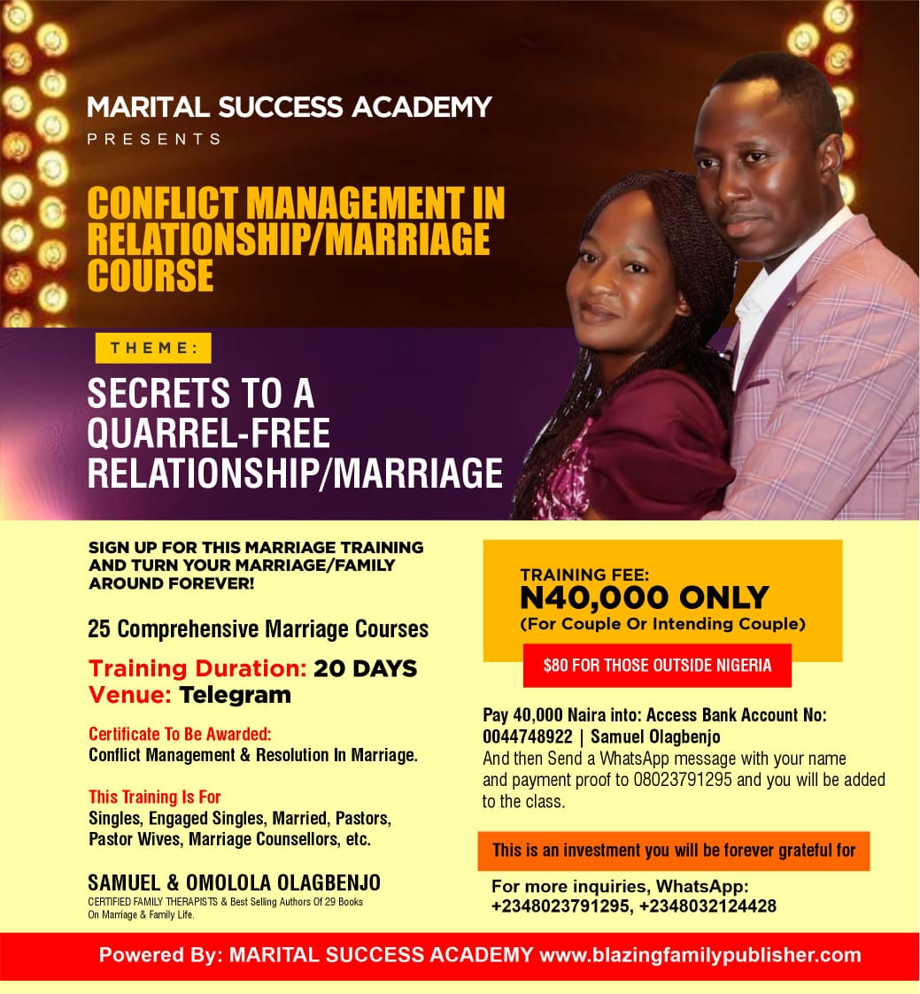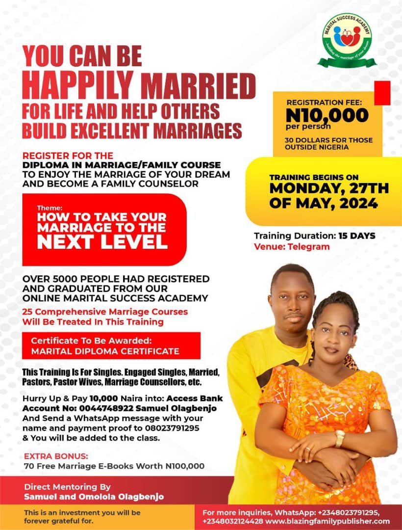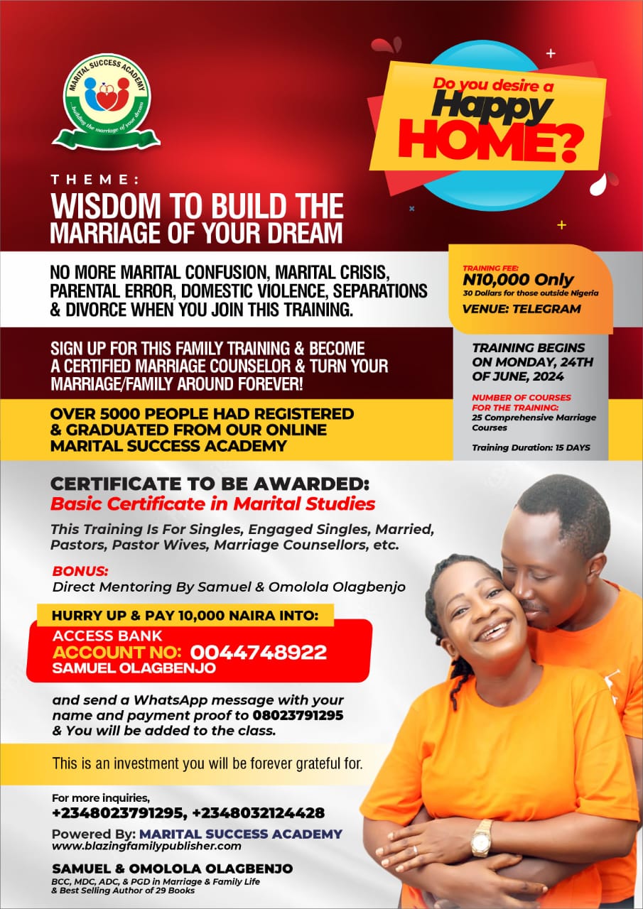 Marital Success Academy, founded by Samuel Olagbenjo is Nigeria’s premier Marriage Institute, offering over 500 courses on Marriage, Parenting, and Family life.